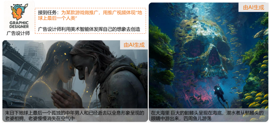 另一个广告设计师接到任务,为某款游戏做推广,用推广视频体现“地球上最后一个人类”。于是他打开美术智能体,发挥自己的想象去创作。