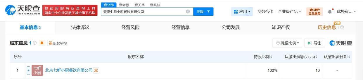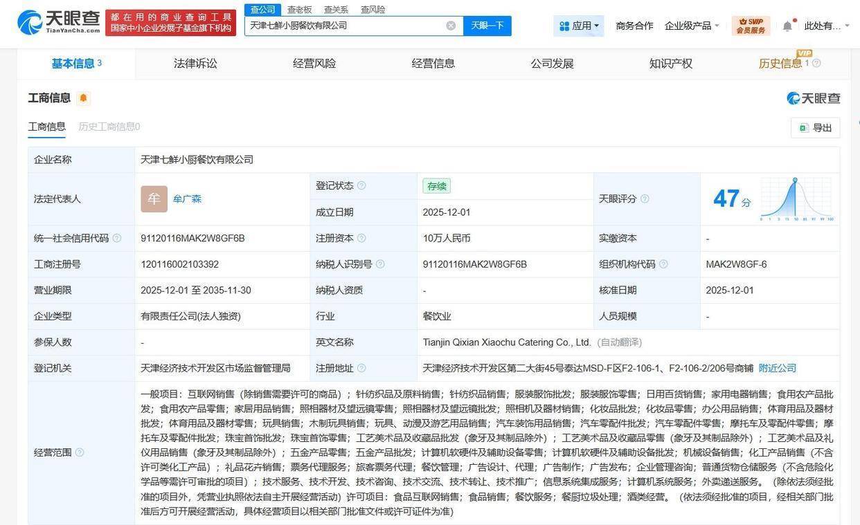 天眼查工商信息显示,12月1日,天津七鲜小厨餐饮有限公司成立,法定代表人为牟广森,注册资本10万元人民币,经营范围含互联网销售、针纺织品及原料销售、日用百货销售、食用农产品零售、票务代理服务、旅客票务代理、餐饮管理等。股东信息显示,该公司由京东旗下北京七鲜小厨餐饮有限公司全资持股。