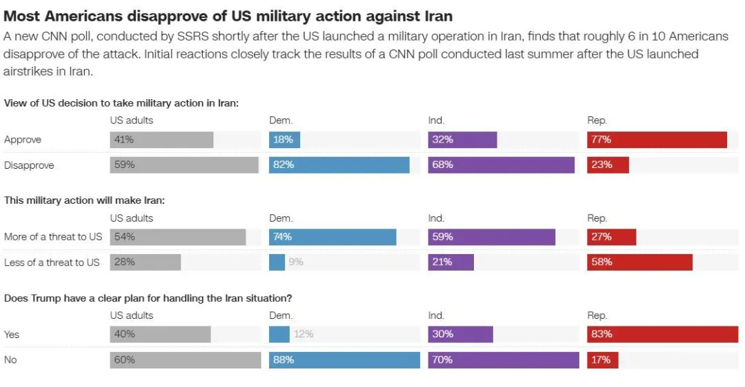 调查显示,高达59%的受访者不赞成对伊朗采取军事行动,给美以的军事行动泼了冷水。39%的人认为美国未先尽力通过外交手段解决问题,仅27%的人觉得美国在对伊动武前尽力外交斡旋。多数受访者还对特朗普应对伊朗局势的方案表示怀疑,60%直言其没有明确应对方案,62%认为他应就任何进一步军事行动获得国会批准。
