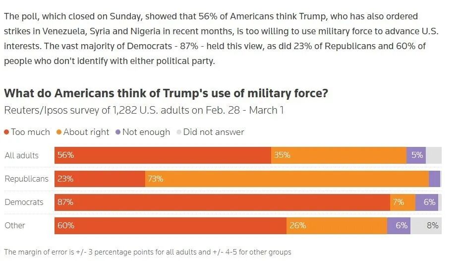 路透社与益普索集团的联合民调进一步揭示,约半数美国人,包括四分之一的共和党人,认为特朗普过于倾向使用武力。数据显示,56%的美国人觉得特朗普在推进美国利益时过于依赖武力手段,他最近几个月还下令对委内瑞拉、叙利亚和尼日利亚发动袭击。在党派层面,87%的民主党人持此观点,23%的共和党人和60%的无党派人士也表达了相同看法,特朗普的“武力外交”引发了广泛不满。
