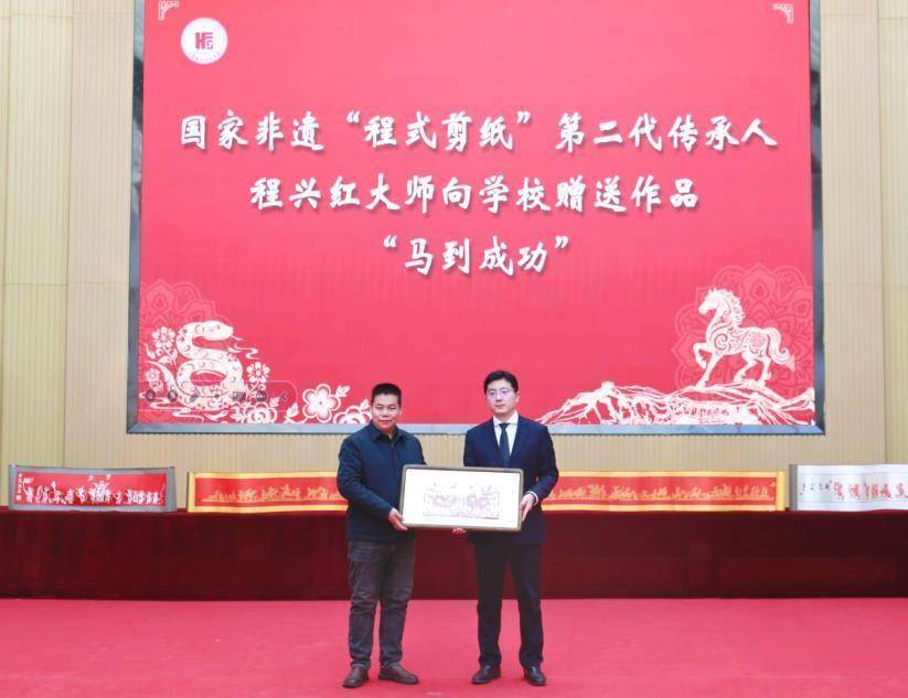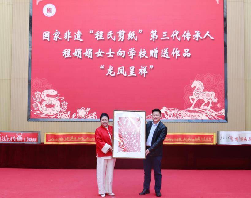 此前,学校举办了“‘阜阳程氏剪纸’国家级非遗展”开展仪式。党委副书记、校长姚本先在致辞中指出,此次程氏剪纸非遗展是学校践行文化传承使命的生动实践,程兴红大师的精品展览、深度讲座与互动体验,让师生理解文化底蕴、体悟传承责任,这既是一堂沉浸式美育课,更是工匠精神的生动诠释。开展仪式由党委副书记、副校长戴玉纯主持。仪式上,程娟娟、程兴红两位传承人分别向学校赠送了剪纸作品《龙凤呈祥》与《马到成功》,由副校长杨春、李凌寒代表学校接受,副校长桂立志为传承人颁发收藏证书。程兴红大师还围绕“阜阳剪纸文化与传承故事”开展了主题讲座,生动阐释了这一国家级非遗项目的艺术特色与精神内涵。